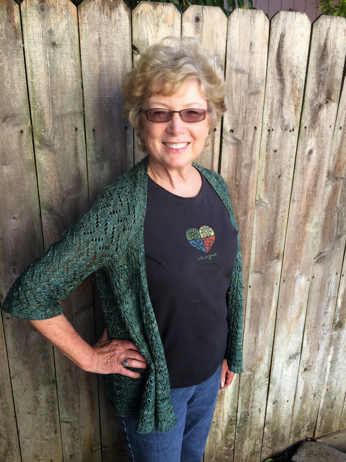 Tracie is working on: 1. Shalom Cardigan by Meghan McFarlane, using Araucania Tepa in the 1788 colorway. 2. Canyonlands Shawl by verybusymonkey, using Blue Heron Rayon Mettalic in the Deep Blue Sea colorway.